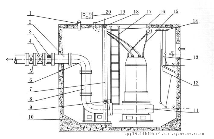 (5) 電泵潛入水中時,應垂直起吊,不允許橫放著地,更不能陷入污泥中。停止使用時應將電泵吊起清洗干凈, 置于干燥處,并注意防凍。