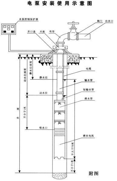 b) . 水泵進水口必須在動水位1米位以下,但潛水不得超過靜水位以下70米,電機下端距井底水深在1米以上。